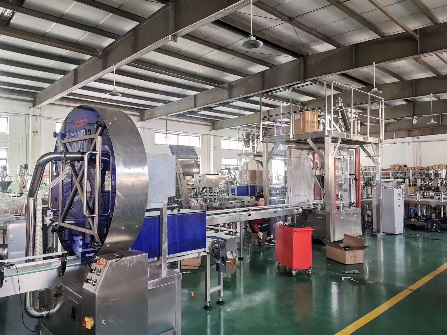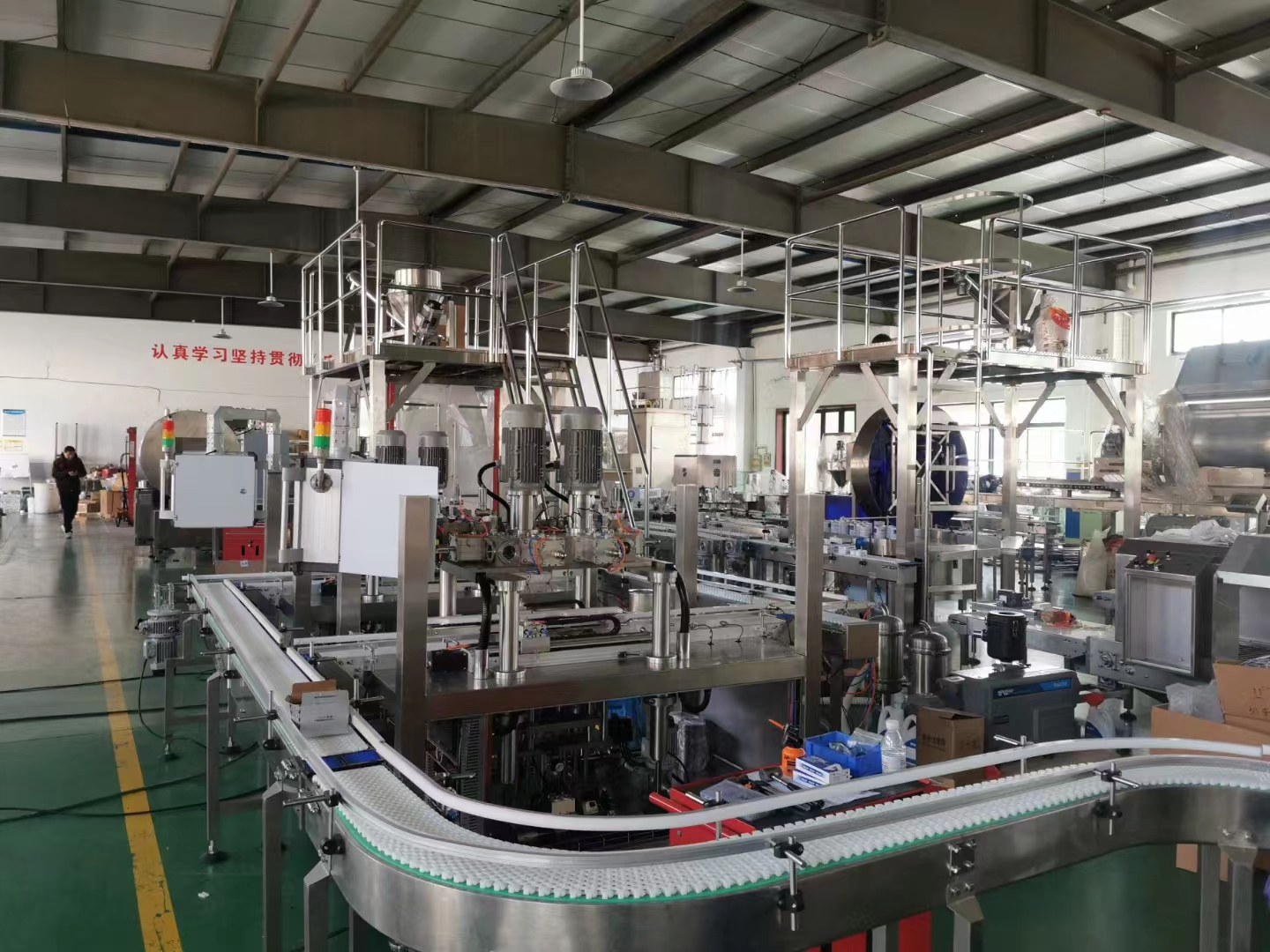 1.原料25KG包裝產線3條,包含原料殺菌,原料混合,螺桿及負壓輸送,成品料倉,機器人裝箱碼垛,底充升降高精度及底充脫氣式主機產線